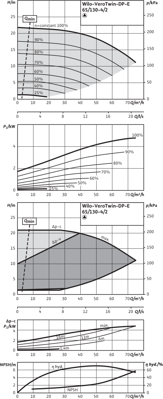 Технический паспорт Характеристики Работа одного насоса Допустимая перекачиваемая среда (другие среды по запросу) Вода систем отопления (согласно VDI 2035) • Водогликолевая смесь (при доле гликоля 20-40 об. % и температуре перекачиваемой...