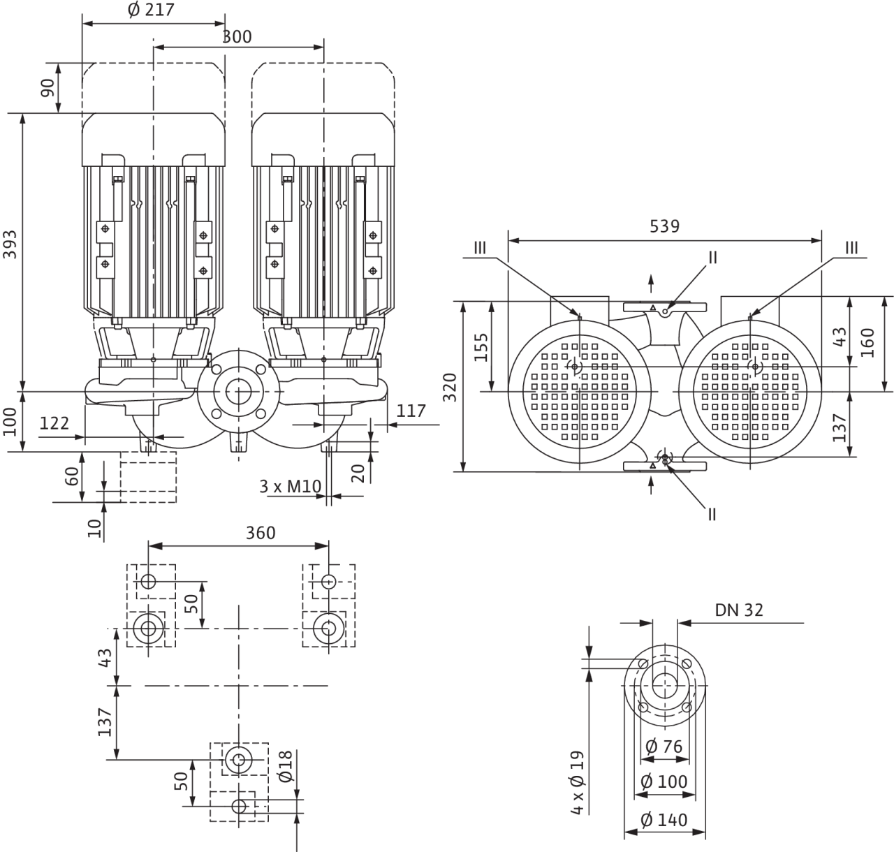 Корпус с опорными ножками для монтажа на фундаменте, консоли по запросу; II отверстие для измерения давления R1/8; III удаление воздуха R1/8