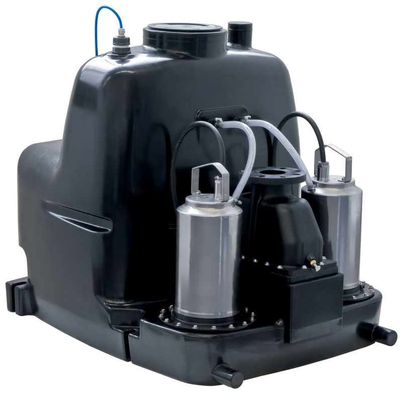 Готовая к подсоединению, полностью затапливаемая автоматическая напорная установка для отвода сточных вод в виде двухнасосной установки с автоматическим переходом с резервного режима на режим пиковой нагрузки. Электродвигатель насоса с сухим ротором в трехфазном исполнении с корпусом из нержавеющей стали и датчиком контроля температуры обмотки электродвигателя. Газо- и водонепроницаемый сборный резервуар из пластмассы с четко определенными подключениями к приточному трубопроводу и системой регулирования уровня при помощи датчика уровня. Центральное подсоединение к напорному патрубку со встроенным разветвленным трубопроводом, двойным обратным клапаном и устройством для подрыва клапана. Прибор управления с микропроцессорным управлением с