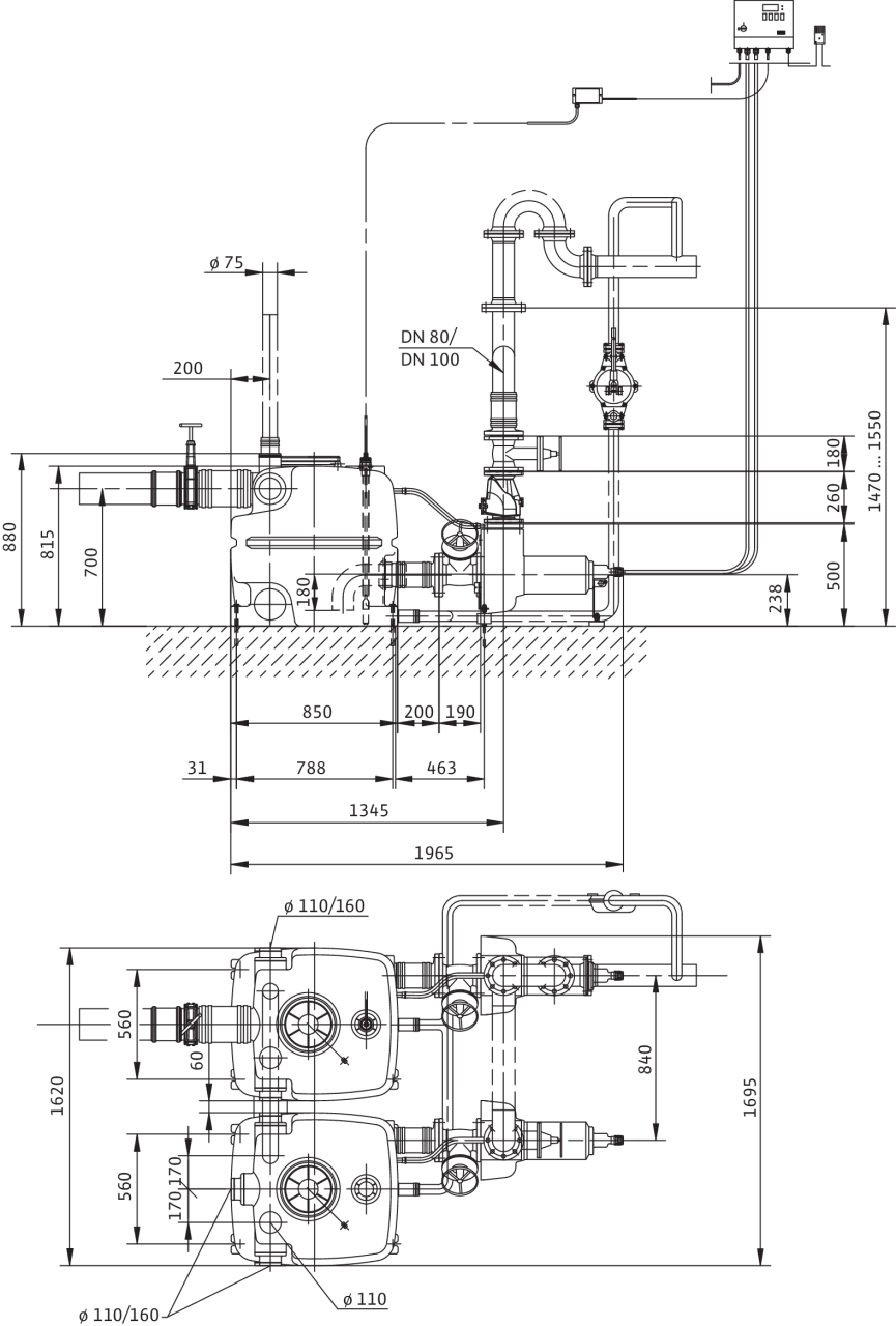 Готовая к подсоединению, полностью затапливаемая автоматическая напорная установка для отвода сточных вод в виде двухнасосной установки с автоматическим переходом с резервного режима на режим пиковой нагрузки. Два отдельно предвключенных непогруженных погружных насоса для отвода сточных вод в трехфазном исполнении с охлаждающим кожухом, корпусом из нержавеющей стали и датчиком контроля температуры обмотки электродвигателя. Два газо- и водонепроницаемых сборных резервуара из пластмассы с четко определенными подключениями к подводящему трубопроводу и системой регулирования уровня при помощи датчика уровня. Прибор управления с микропроцессорным управлением с