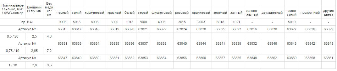 Сечения 0,5 мм², 0,75 мм² и 1 мм² соответствуют H05 V-K,