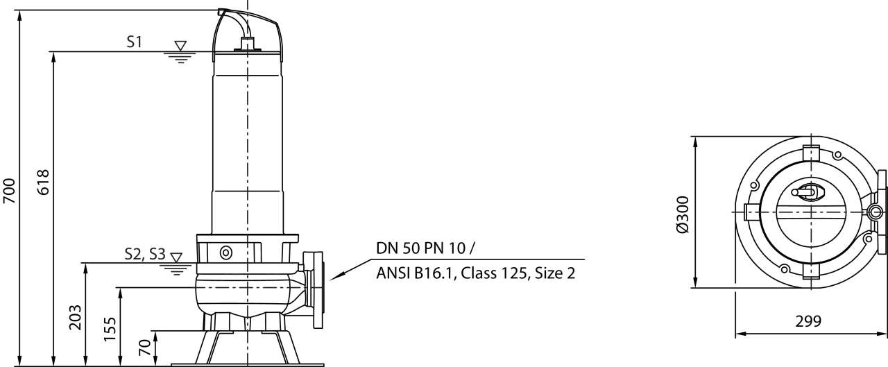 Полностью погружной дренажный насос для отвода сточных вод для стационарной и мобильной установки в погруженном состоянии, для перекачивания загрязненной воды и сточных вод с фекалиями (область применения согласно EN 12050). Гидравлический корпус и рабочее колесо из серого чугуна, корпус электродвигателя из нержавеющей стали. Электродвигатель насоса с сухим ротором в исполнении для трехфазного тока с камерой уплотнений и датчиком температуры обмотки электродвигателя. Соединительный кабель длиной 10 м со свободными концами. Уплотнение со стороны перекачиваемой жидкости и со стороны электродвигателей осуществляется двумя скользящими торцевыми уплотнениями независимо от направления вращения.