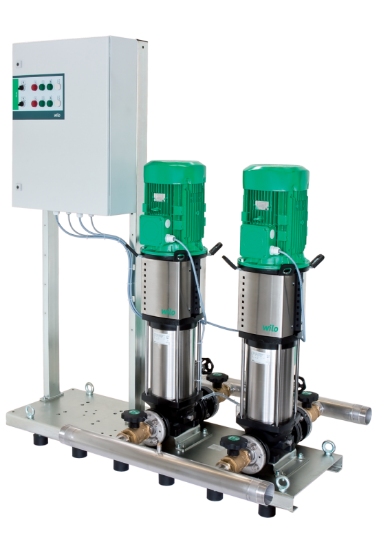 Установка повышения давления с непрямым подключением и автоматическая компактная установка со сдвоенным насосом, представляющая собой дублирующее исполнение однонасосной установки для пожаротушения.
