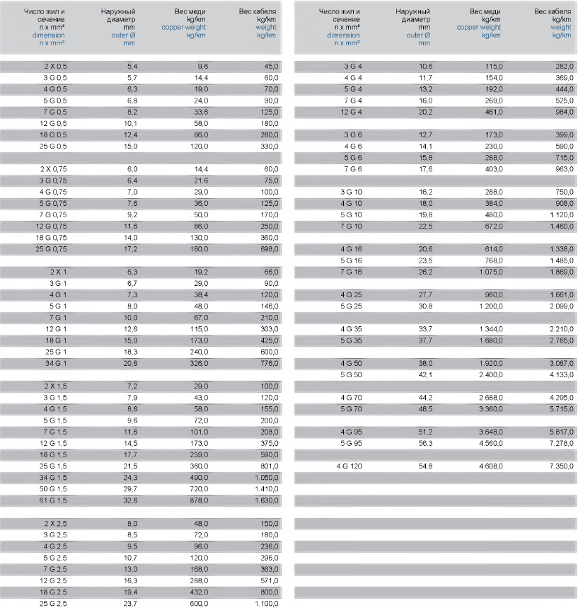 | Артикул | Название | Информация | Диаметр | Размеры | Вес меди | Вес кабеля |
