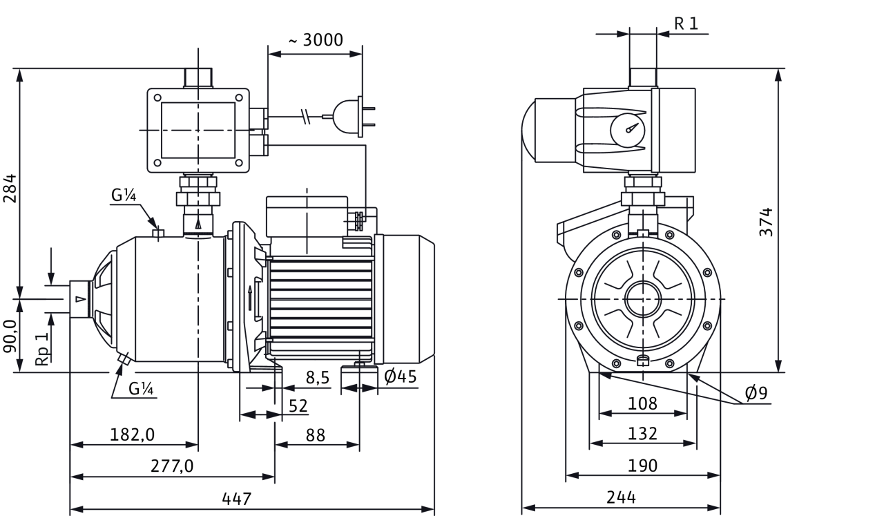 Установка с центробежным насосом в компактном исполнении с горизонтальным всасывающим и вертикальным напорным патрубком, которая состоит из следующих компонентов: самовсасывающий многоступенчатый горизонтальный высоконапорный центробежный насос с низким уровнем шума со сквозным насосным валом электродвигателя и не зависящим от направления вращения скользящим торцовым уплотнением. Напрямую присоединенный фланцами однофазный электродвигатель со встроенным термическим защитным выключателем и конденсатором. Система управления насосом с электронным устройством контроля давления и потока, встроенной защитой от сухого хода и обратным клапаном. Гидравлический всасывающий тракт нового типа, особенно подходящий для использования дождевой воды из цистерн и глубоко расположенных резервуаров. Все детали, находящиеся в контакте с перекачиваемой средой, не подвержены коррозии. Насосная установка предварительно установлена в готовом к подключению виде и подключается с помощью кабеля длиной 3 м и сетевого штекера.
