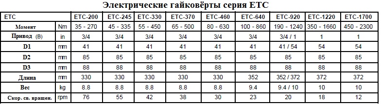 Характеристики — Гайковёрты серии ETC и EIP (Электрические моментные гайковёрты)