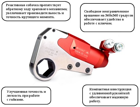 Гидравлические ключи с низким профилем серии H созданы для работы в труднодоступных местах и имеют несколько сменных кассет и переходников. Можно быстро и легко произвести замену основных деталей при помощи простых инструментов. Легкость смены креплений позволяет экономить время. Легкий алюминиевый корпус обеспечивает легкость в работе, даже при наличии ржавчины.