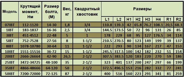 Основные характеристики гайковертов серии IBT.