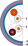 | Конструкция 1. Медный проводник диаметром 0,52 мм (24 AWG) *. 2. Полиэтиленовая изоляция. 3. Общий экран. 4. Полимерная оболочка. * — Для передачи данных на расстояния, больших, чем указано в стандартах, возможно использование медной проволоки диаметром 0,64 мм (22AWG) |