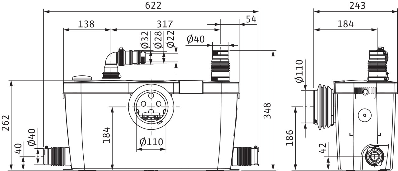Готовая к подключению автоматическая напорная установка для отвода сточных вод с низким уровнем шума согласно стандарту EN 12050-3 со всеми необходимыми переключающими и управляющими устройствами.