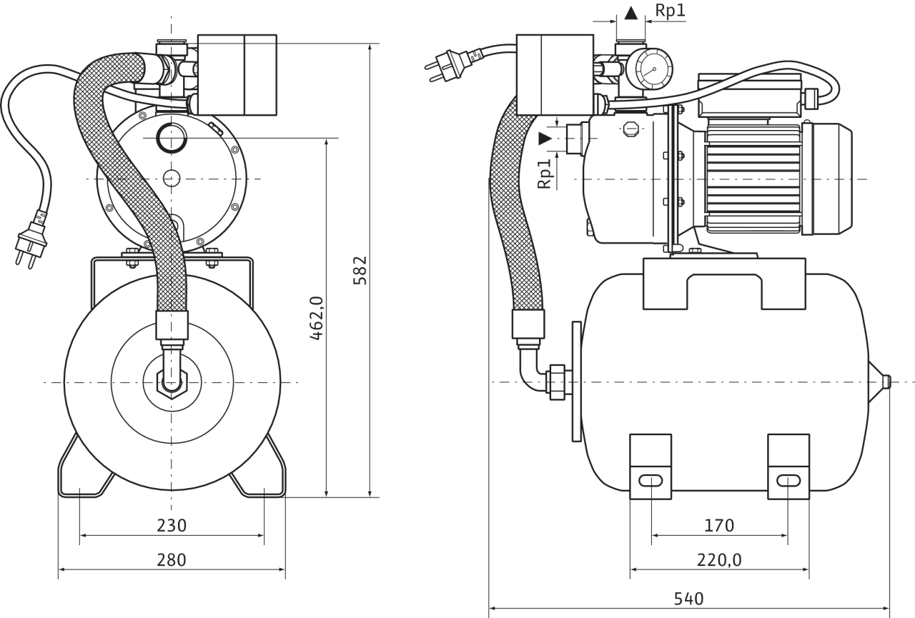 Система управления насосом с управляющим агрегатом и мембранным напорным баком, манометрическим выключателем и манометром (0–6 бар). Все детали, находящиеся в контакте с перекачиваемой средой, не подвержены коррозии.