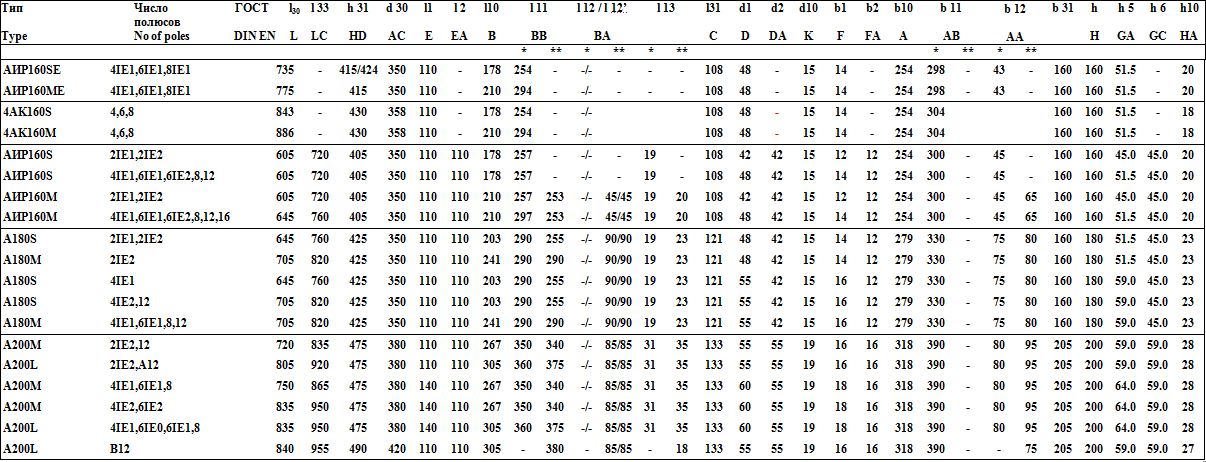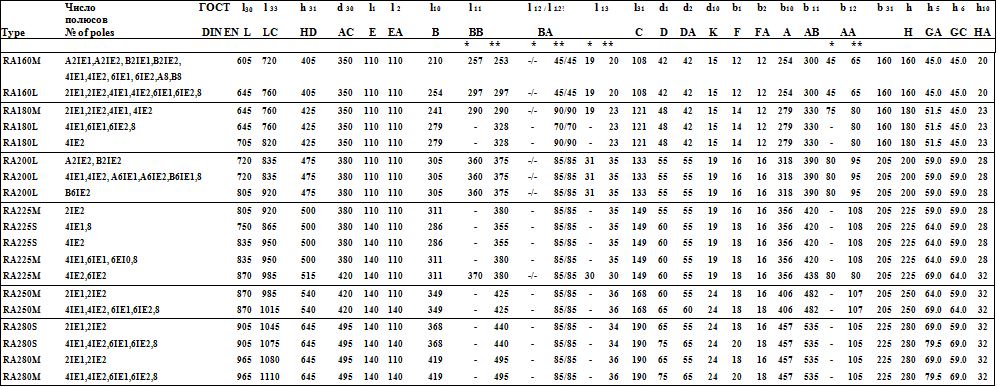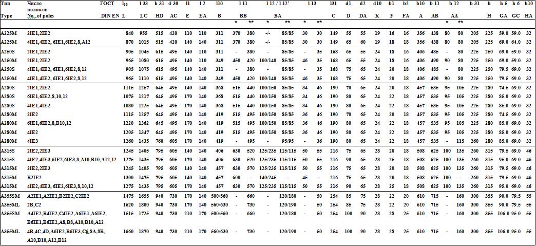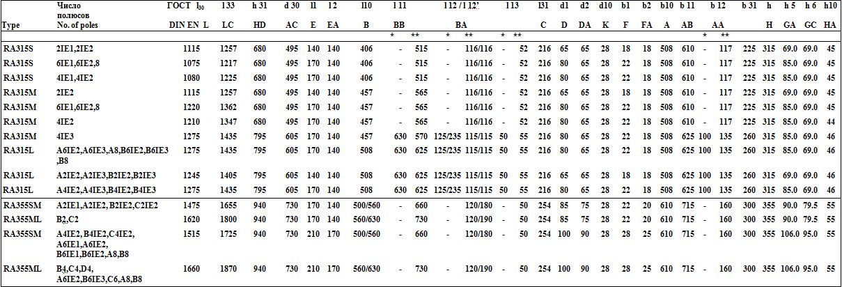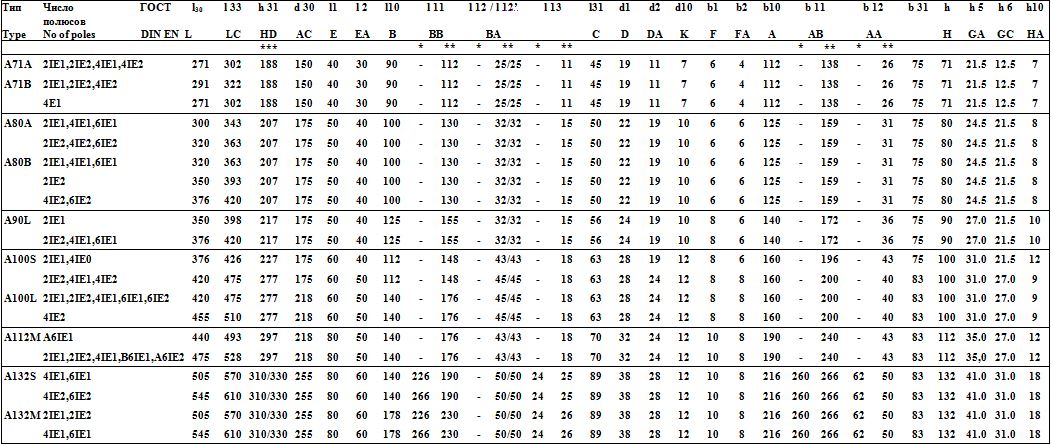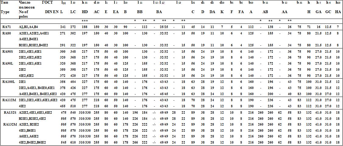 *** — для исполнений станины из алюминия/чугуна