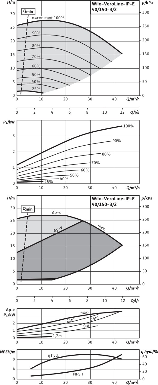 • Интерфейсы: Управляющий вход «Выкл. по приоритету», «Внешняя смена насосов» (действует только в режиме работы сдвоенного насоса), аналоговый вход 0–10 В, 2–10 В, 0–20 мА, 4–20 мА для ​режима управления (DDC) или дистанционного регулирования заданных значений, аналоговый вход 0–10 В, 2–10 В, 0–20 мА, 4–20 мА для передачи сигнала фактического значения датчика давления, инфракрасный интерфейс для беспроводной связи с устройством управления и сервисного обслуживания – IR-картой памяти/IR-монитором Wilo, разъем для IF-модуля Wilo Modbus, BACnet, CAN, PLR, LON для связи с автоматизированной системой управления зданием, настраиваемая беспотенциальная система оповещения о неисправностях, эксплуатации и готовности, интерфейс для связи со сдвоенными насосами;