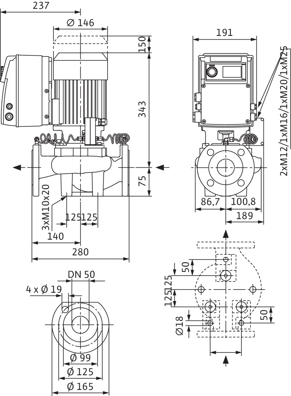 Центробежный насос с сухим ротором линейного типа для установки в трубах или на фундаменте со встроенным частотным преобразователем для электронного регулирования параметров, в том числе постоянного или переменного перепада давления (Δp-c/Δp-v). Трехфазный электродвигатель с частотным преобразователем