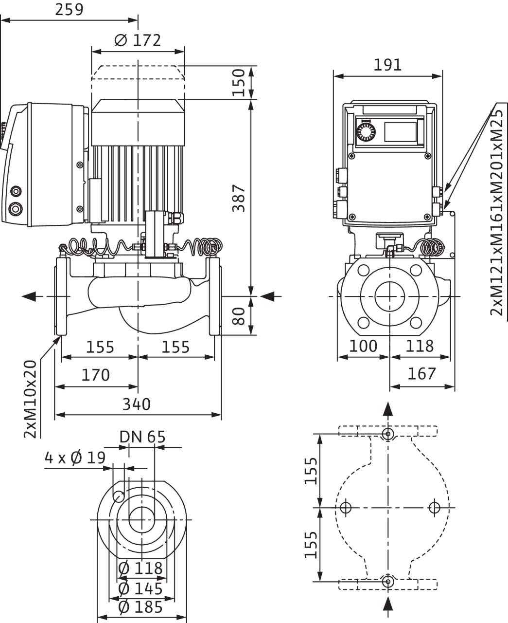 Центробежный насос с сухим ротором линейного типа для установки в трубах или на фундаменте со встроенным частотным преобразователем для электронного регулирования параметров, в том числе постоянного или переменного перепада давления (Δp-c/Δp-v). Трехфазный электродвигатель с частотным преобразователем