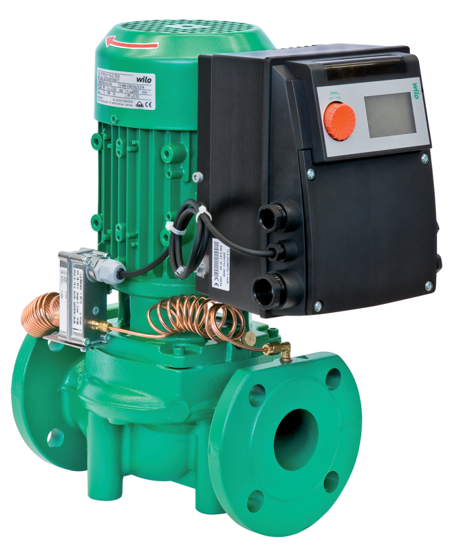 Центробежный насос с сухим ротором линейного типа для установки в трубах или на фундаменте со встроенным частотным преобразователем для электронного регулирования параметров, в том числе постоянного или переменного перепада давления (Δp-c/Δp-v). Трехфазный электродвигатель с частотным преобразователем