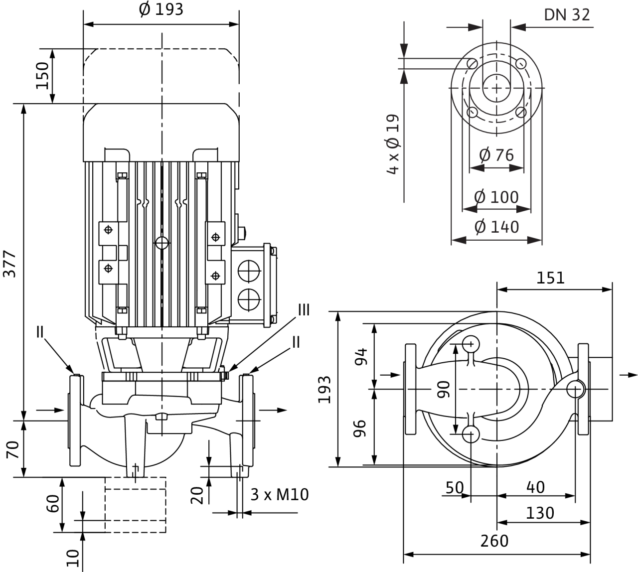 Корпус с опорными ножками для монтажа на фундаменте, консоли по запросу; II отверстие для измерения давления R1/8; III удаление воздуха R1/8