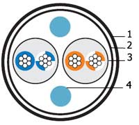 Неэкранированный кабель категории 5e для абонентских шнуров состоит из 2 витых пар свитых вместе с силовыми элементами, защищенных двойной оболочкой из ПВХ-компаунда. Кабель предназначен для применения в рамках промышленных сетей Industrial Ethernet.