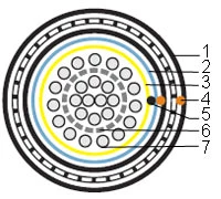 1 - Внешняя оболочка 2 - Экран-фольга 3 - Защитная пленка 4 - Рип-корд 5 - Дренажный провод 6 - Полимерная лента 7 - Витая пара solid |
