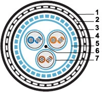 Этот кабель передачи данных разработан для приложений типа RS-422 и RS-485. В состав кабеля входят три индивидуально экранирвоанные витые пары, свитые вместе, заключенные в общий экран из алюминиевой фольги и медной оплетки. Экранированный сердечник защищен гофрированной стальной броней и внешней сверхпрочной оболочкой из светостабилизированного полиэтиленового компаунда. Кабель подходит для внутренней и внешней прокладки.