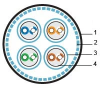 1 - Внешняя оболочка 2 - Экран-сетка 3 - Экран-фольга 4 - Витая пара solid |