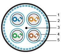1 - Внешняя оболочка 2 - Экран-сетка 3 - Дренажный провод 4 - Экран-фольга 5 - Витая пара solid |