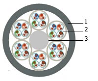 1 - Внешняя оболочка 2 - Пучок из 4-х экранированных витых пар solid 3 - Центральный силовой элемент |