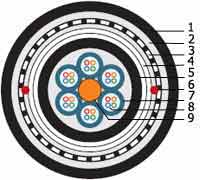 Кабель волоконно-оптический 9/125 одномодовый, 8 волокон, многомодульная конструкция (multi loose tube), усиленный, бронированный, влагостойкий, для внешней прокладки, PE |