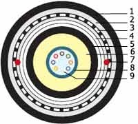 1 - Внешняя оболочка 2 - Гидрофобный наполнитель 3 - Бронированная лента 4 - Гидроизолирующая лента 5 - Внутренняя оболочка 6 - Упрочняющие нити 7 - Рип-корд 8 - Модульная трубка 9 - Оптическое волокно |