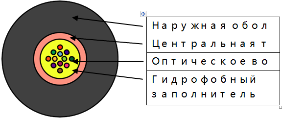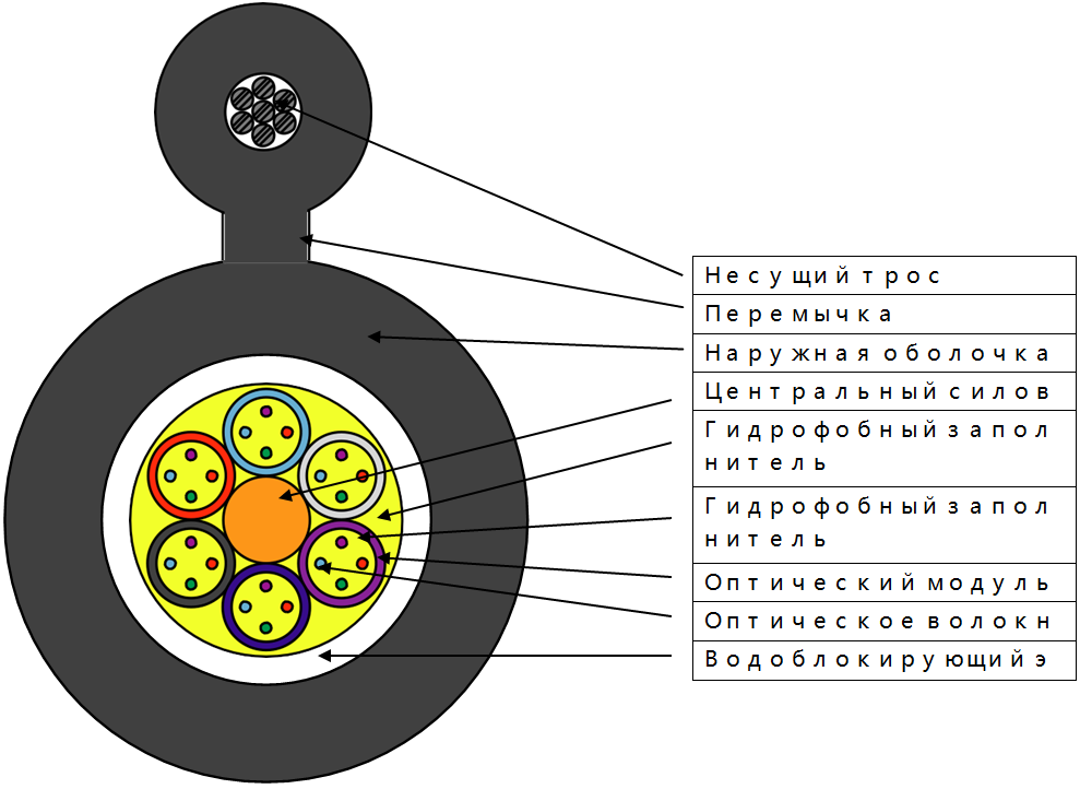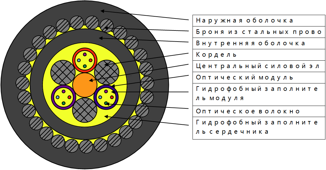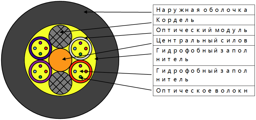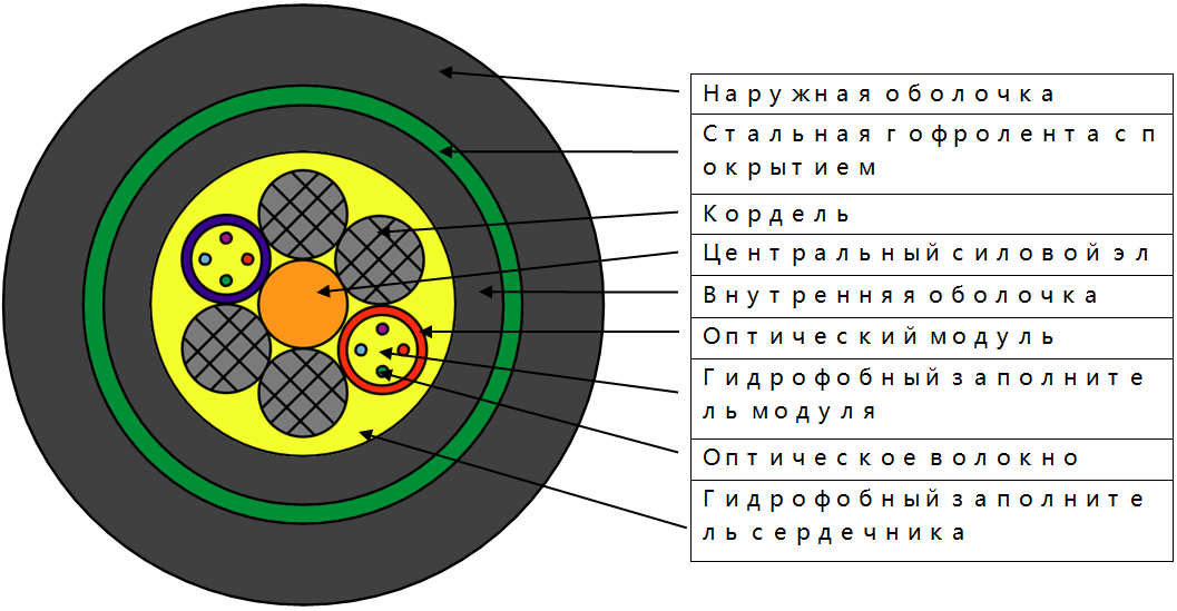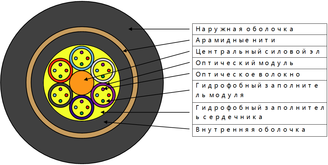 Окраска оптических волокон и оптических модулей в кабеле позволяет их однозначное определение при монтаже.