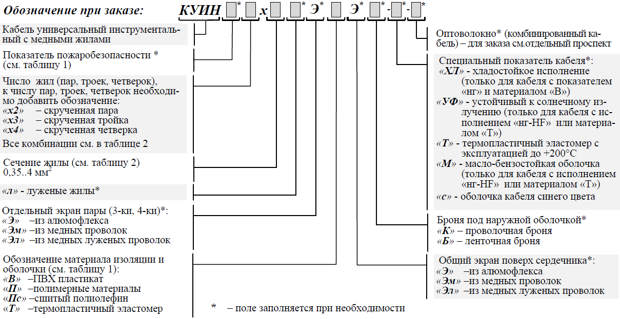Пример обозначения при заказе: «Кабель КУИН нг 10х3х0,75 ВЭ-ХЛ ТУ 3581-010-76960731-2008» – кабель, не распространяющий горение при групповой прокладке, с изоляцией и оболочкой из ПВХ пластиката, в холодостойком исполнении (эксплуатация при температуре от -60° до +80°С), в общем экране из алюмофлекса, без брони, c десятью тройками медных жил номинальным сечением 0,75 мм².