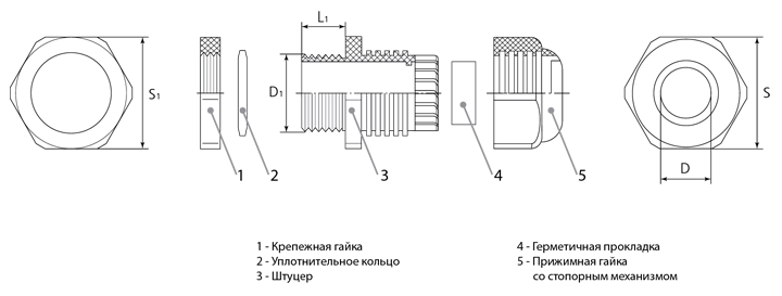 | Товарные позиции | D(мм) | D1(мм) | L1(мм) | S(мм) | S1(мм) | Вводная резьба | Монтажное отверстие (мм) |