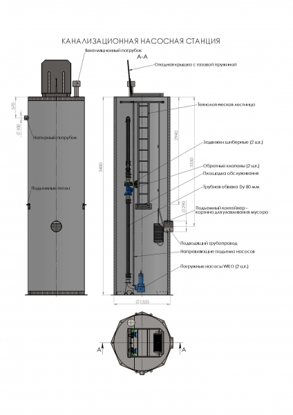 Функционально КНС состоит из приемной емкости, куда поступает вода через встроенный контейнер для мусора. Контейнер предназначен для улавливания крупных загрязнений. Далее вода, при помощи погружных канализационных насосов, поступает в напорный трубопровод, на котором установлены задвижки и обратный клапан. Обратный клапан, установленный на напорном трубопроводе, не позволяет опорожняться напорному трубопроводу обратно в корпус. Для удобства обслуживания оборудования и арматуры канализационной насосной станции в емкости имеется площадка обслуживания и лестница. КНС комплектуются блоком автоматического управления, канализационными насосными агрегатами WILO. Система контроля уровня осуществляется датчиками уровня. Датчики уровня предназначены: для включения – отключения рабочих и резервных насосных агрегатов, для сигнализации, при переполнении приемного резервуара. Блок управления размещается во влагозащищенном и отапливаемом корпусе, вблизи КНС и не требует специальных построек. Для обслуживания установок имеется смотровой люк, диаметр которого позволяет произвести обслуживание насосных агрегатов изнутри. Перемещение насосов внутри емкости осуществляется грузоподъемными механизмами и устройствам по направляющим штангам.