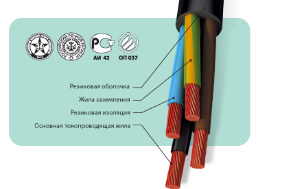 Пример условного обозначения кабеля с тремя основными и одной жилой заземления: «Кабель КГ 3х35+1х10 ТУ 16.К73.05-93».