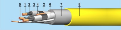 Примечание: Применение в качестве материала изоляции вспомогательной жилы блоксополимера пропилена с этиленом обеспечивает её высокую сохранность при многократных изгибах кабеля, что продлевает срок его эксплуатации. По желанию потребителя кабель может быть изготовлен в оболочке яркого цвета.