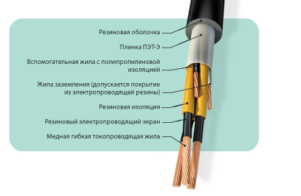 Кабели предназначены для присоединения экскаваторов и других передвижных механизмов или электроустановок к электрическим сетям с изолированной нейтралью при номинальном напряжении переменного тока частотой 50 Гц основных жил — 6 кВ, вспомогательных— 0,38 кВ.