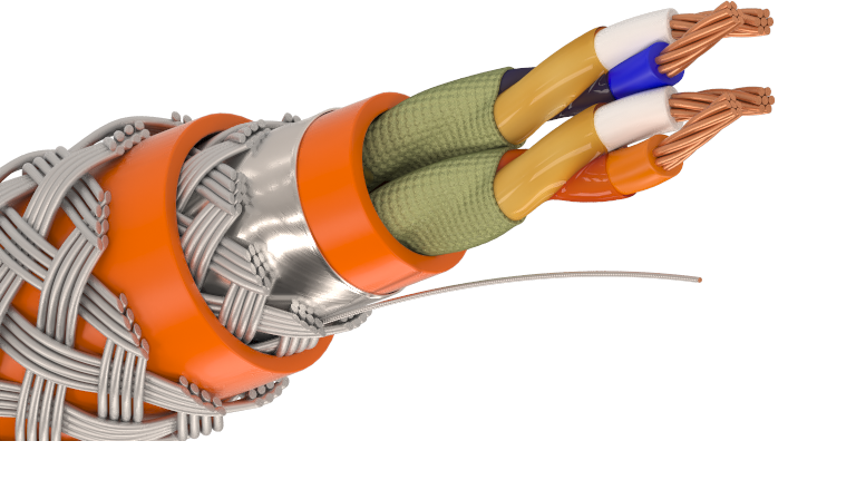 Кабель гибкий, с многопроволочными медными жилами, огнестойкий, с обмоткой жил полиимидной пленкой в витой паре, с дополнительным термическим барьером поверх каждой пары, с поясной изоляцией, с общим экраном из ламинированной алюминиевой фольги с контактным проводником, с дополнительной оплеткой из медной луженой проволоки, с оболочкой из полимерных материалов, с броней из стальных оцинкованных проволок. Конструкция кабеля: Жилы: многопроволочные медные. Номинальный диаметр токопроводящих жил кабелей, мм: 0,78; 0,90; 1,10; 1,20; 1,50; 2,00 Изоляция: огнестойкая кремнийорганическая резина. Обмотка жил: пары с полиимидной пленкой скручены в сердечник с числом пар до 37 Дополнительный огнестойкий барьер: слюдосодержащая лента. Поясная изоляция: FRLS – ПВХ пластикат пониженной пожароопасности, с низким дымо- и газовыделением; FRHF – полимерная композиция, не содержащая галогенов; FRLSLTx – низкотоксичный ПВХ пластикат пониженной пожароопасности, с низким дымо- и газовыделением. Экран: общий из ламинированной алюминиевой фольги с контактным проводником и оплеткой из медной луженой проволоки. Оболочка: FRLS – ПВХ пластикат пониженной пожароопасности, с низким дымо- и газовыделением, оранжевого цвета; FRHF – полимерная композиция, не содержащая галогенов, оранжевого или черного цвета; FRLSLTx – низкотоксичный ПВХ пластикат пониженной пожароопасности, с низким дымо- и газовыделением, оранжевого цвета. Броня: из стальных оцинкованных проволок. Модификации: КИМ-СБГСКГнг(А)-FRLS – с огнестойкой изоляцией, с оболочкой из полимерных материалов пониженной пожароопасности, с пониженным дымо- и газовыделением, не распространяющий горение при групповой прокладке по категории А, огнестойкий. КИМ-СБГСКГнг(А)-FRHF – с огнестойкой изоляцией, с оболочкой из полимерных компаундов, не содержащих галогенов, не распространяющий горение при групповой прокладке по категории А, не выделяющий коррозионно-активных газообразных продуктов при горении и тлении, огнестойкий. КИМ-СБГСКГнг(А)-FRLSLTx – с огнестойкой изоляцией, с оболочкой из полимерных материалов пониженной пожароопасности, с пониженным дымо- и газовыделением, с низкой токсичностью продуктов горения, не распространяющий горение при групповой прокладке по категории А, огнестойкий. Примечание: Конструктивные модификации и дополнительные индексы: в холодостойком исполнении, индекс «ХЛ» с повышенной стойкостью к воздействию минерального масла и бензина, индекс «МС» стойкий к солнечным излучениям (УФ) и атмосферным осадкам (с оболочкой черного цвета); бронированные кабели защищены от внешних механических воздействий, в том числе причиняемых грызунами; гибкие кабели применяются для прокладки в труднодоступных местах с малым радиусом изгиба; с дополнительным термическим барьером для применения на объектах с повышенными требованиями к механической прочности изоляции, в том числе в условиях воздействия открытого пламени. Класс пожарной опасности: В соответствии с ГОСТ 31565-2012 КИМ-СБГСКГнг(А)-FRLS – П1б.1.2.2.2 КИМ-СБГСКГнг(А)-FRHF – П1б.1.1.2.1 КИМ-СБГСКГнг(А)-FRLSLTx – П1б.1.2.1.2 Нераспространение горения при групповой прокладке (категория А) Огнестойкость 180 минут Температура окружающей среды при эксплуатации кабеля: FRLS, FRLSLTx монтаж: от -10°C до +50°C эксплуатация: от -50°C до +70°C FRHF монтаж: от -30°C до +60°C эксплуатация: от -60°C до +90°C Минимал