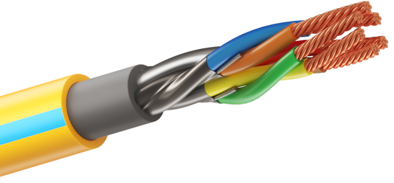 Технические характеристики (краткие) Класс медных токопроводящих жил (по ГОСТ 22483): однопроволочные – 1 класс, многопроволочные «мж» – 3 или 4 класс, кабелей повышенной гибкости «Г» – 5 класс Номинальное сечение токопроводящей жилы: 0,12 мм²; 0,20 мм²; 0,35 мм²; 0,5 мм²; 0,75 мм²; 1,00 мм²; 1,5 мм²; 2,5 мм² Токопроводящие жилы скручены в пары с целью снижения влияния электромагнитных помех. Диапазон применения от –70°С до +250°C Минимальная температура эксплуатации кабелей: –70°С кабели исполнения «ЭХЛ» –60°С кабели исполнения «ХЛ» –50°С кабели обычного исполнения Максимальная температура эксплуатации кабелей: +250°С оболочка и изоляция из высокотемпературной композиции «Y-250» +220°С оболочка и изоляция из фторопласта «Ф» +150°С оболочка и изоляция из термопластичного эластомера повышенной теплостойкости «Т-150» +120°С оболочка и изоляция из термопластичного эластомера «Т» или полиуретана «У» +75°С все остальные кабели Минимальная температура монтажа, не ниже: не ниже минус (20±2) °С – с индексом нг(А)-LS, нг(А)-LSLTx не ниже минус (35±2) °С – с обозначением «ХЛ» не ниже минус (15±2) °С – для остальных типов кабелей Климатическое исполнение В, категория размещения 1-5 (по ГОСТ 15150). Возможно применение во всех макроклиматических районах, включая тропики. Кабели в исполнении «з» – для применения во взрывоопасных зонах – имеют круглую форму и подложку (специальное заполнение), полученную методом экструзии, препятствующую свободному распространению газов под оболочкой. Сопротивление жил постоянному току соответствует ГОСТ 22483 Номинальное напряжение: до ≈380В частотой до 125 кГц Электрическое сопротивление изоляции при температуре t = +20°C, не менее: ПВХ, кремнийорганическая резина, полиуретан, термопластичный эластомер – 100 МОм•км полимерная композиция, не содержащая галогенов – 12 МОм•км высокотемпературная композиция, фторопласт – 250 МОм•км Испытание напряжением в течение 1 мин: между жилами ≈2500В 50Гц между всеми жилами и экраном ≈3000В 50Гц Кабели огнестойкие, сохраняют работоспособность в условиях пожара не менее 180 минут (ПО1 по ГОСТ 31565-2012). Огнестойкость достигается применением слюдосодержащих лент или кремнийорганической резины «Р». Кабели с низкой токсичностью продуктов горения «LTx» – самые пожаробезопасные Значение радиуса изгиба (D – наружный диаметр кабеля): 6D – для небронированных кабелей 12D – для бронированных кабелей