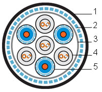 | 1 - Внешняя оболочка 2 - Экран-сетка 3 - Защитная пленка 4 - Медный кабель 5 - Коаксиальный кабель |