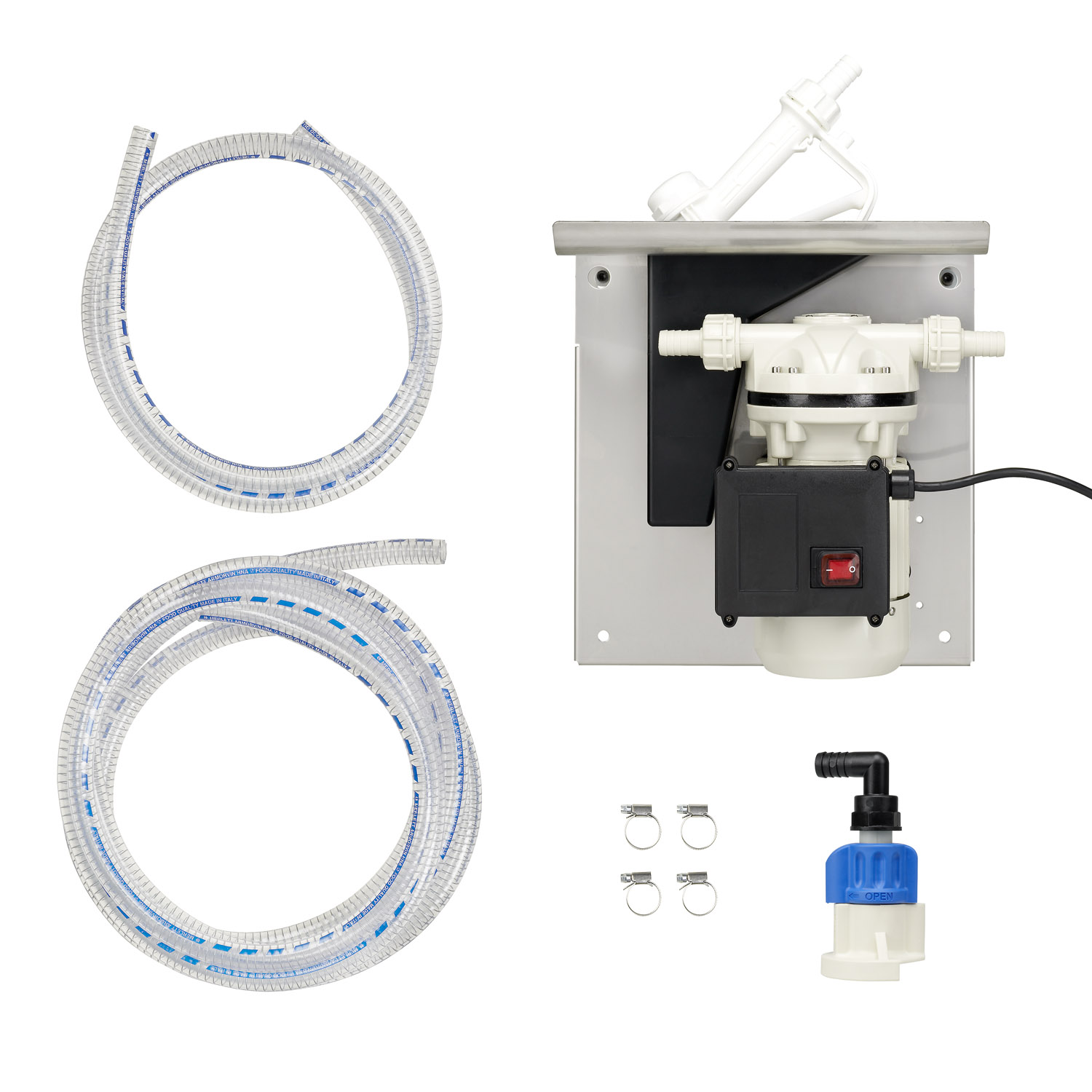 Мембранный насос со встроенным байпасом Выключатель Кронштейн для монтажа на резервуаре Держатель раздаточного пистолета Раздаточный шланг 6 м, Ду 19 Заборный шланг, 2 м, Ду 19 Переходник для резервуара IBC Механический пистолет для...