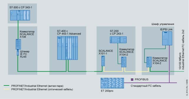 В типовом варианте конверторы SCALANCE X-100 размещаются в одном шкафу управления с подключаемым сетевым узлом. Они могут включаться в линейные, звездообразные и кольцевые сетевые структуры.