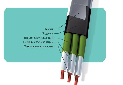 Кабель с медными жилами, с двухслойной полиэтиленовой изоляцией, бронированный стальной оцинкованной лентой, плоский, с длительно допустимой температурой нагрева жил +90 °С.