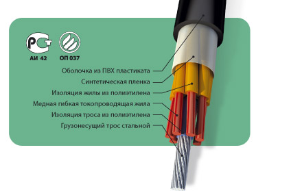 КПВЛ — кабель с медными жилами сечением 1,0 мм2 с полиэтиленовой изоляцией, со стальным грузонесущим тросом, в оболочке из ПВХ пластиката.