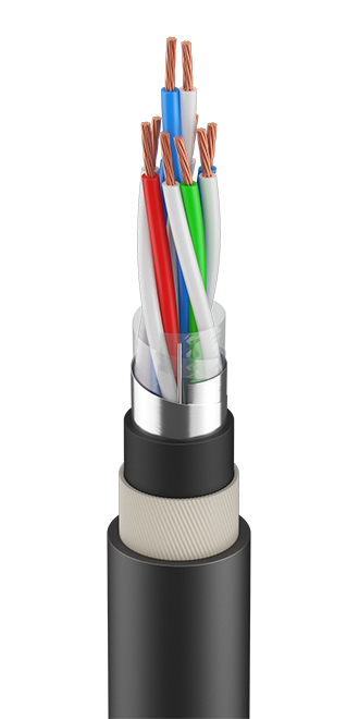 Кабель для сигнализации и блокировки с многопроволочными токопроводящими жилами из мягкой медной проволоки, с полиэтиленовой изоляцией, с поясной изоляцией из ПЭТ-Э плёнки, в экране из алюмофлекса, с внутренней оболочкой из полимерной безгалогеновой композиции, с бронёй из стеклопрутка и защитным шлангом из полимерной безгалогеновой композиции.