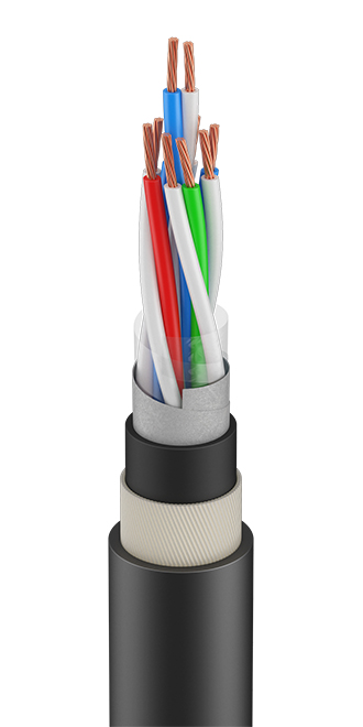 Кабель для сигнализации и блокировки с многопроволочными токопроводящими жилами из мягкой медной проволоки, с изоляцией из полимерной безгалогеновой композиции, с поясной изоляцией из ПЭТ-Э плёнки, термического барьера из стеклоленты, внутренней оболочкой из полимерной безгалогеновой композиции, с бронёй из стеклопрутка и с защитным шлангом из полимерной безгалогеновой композиции.