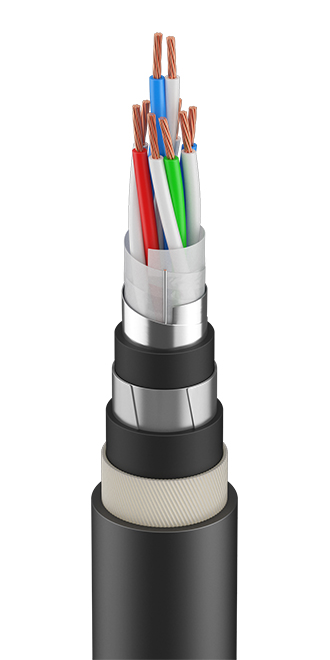 Кабель для сигнализации и блокировки с многопроволочными токопроводящими жилами из мягкой медной проволоки, с изоляцией из полимерной безгалогеновой композиции, с поясной изоляцией из ПЭТ-Э плёнки, с ВБ элементами, с экраном из алюмофлекса, с внутренней оболочкой из полимерной композиции, не содержащей галогенов, с бронёй из стеклопрутка, с защитным покровом, состоящим из 2-х стальных оцинкованных лент и защитного шланга из полимерной безгалогеновой композиции.