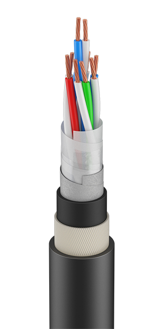 Кабель для сигнализации и блокировки с многопроволочными токопроводящими жилами из мягкой медной проволоки, с изоляцией из полимерной безгалогеновой композиции, с поясной изоляцией из ПЭТ-Э плёнки, термического барьера из стеклоленты, с ВБ элементами, с внутренней оболочкой из полимерной безгалогеновой композиции, с бронёй из стеклопрутка и с защитным шлангом из полимерной безгалогеновой композиции.