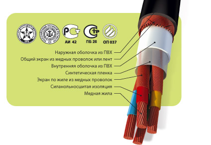 Изоляция из полиолефиновой композиции, экранированные жилы, оболочка из ПВХ пластиката пониженной пожароопасности, не распространяющей горение, с пониженным дымо- и газовыделением |