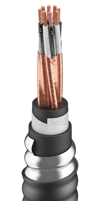 Кабель для систем промышленной автоматики, с токопроводящими жилами из медных проволок с изоляцией и оболочкой из полимерных материалов, с индивидуально экранированными элементами, с герметичной гофрированной металлической бронёй.