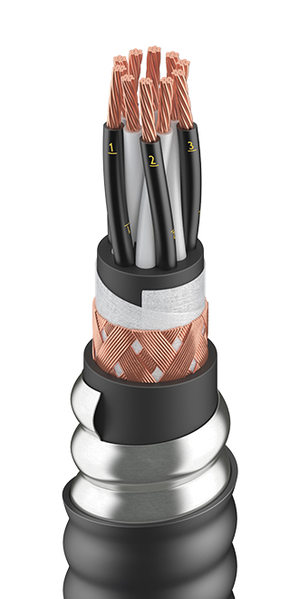 Кабель для систем промышленной автоматики, с токопроводящими жилами из медных проволок с изоляцией и оболочкой из полимерных материалов, с общим экраном, с герметичной гофрированной металлической бронёй.